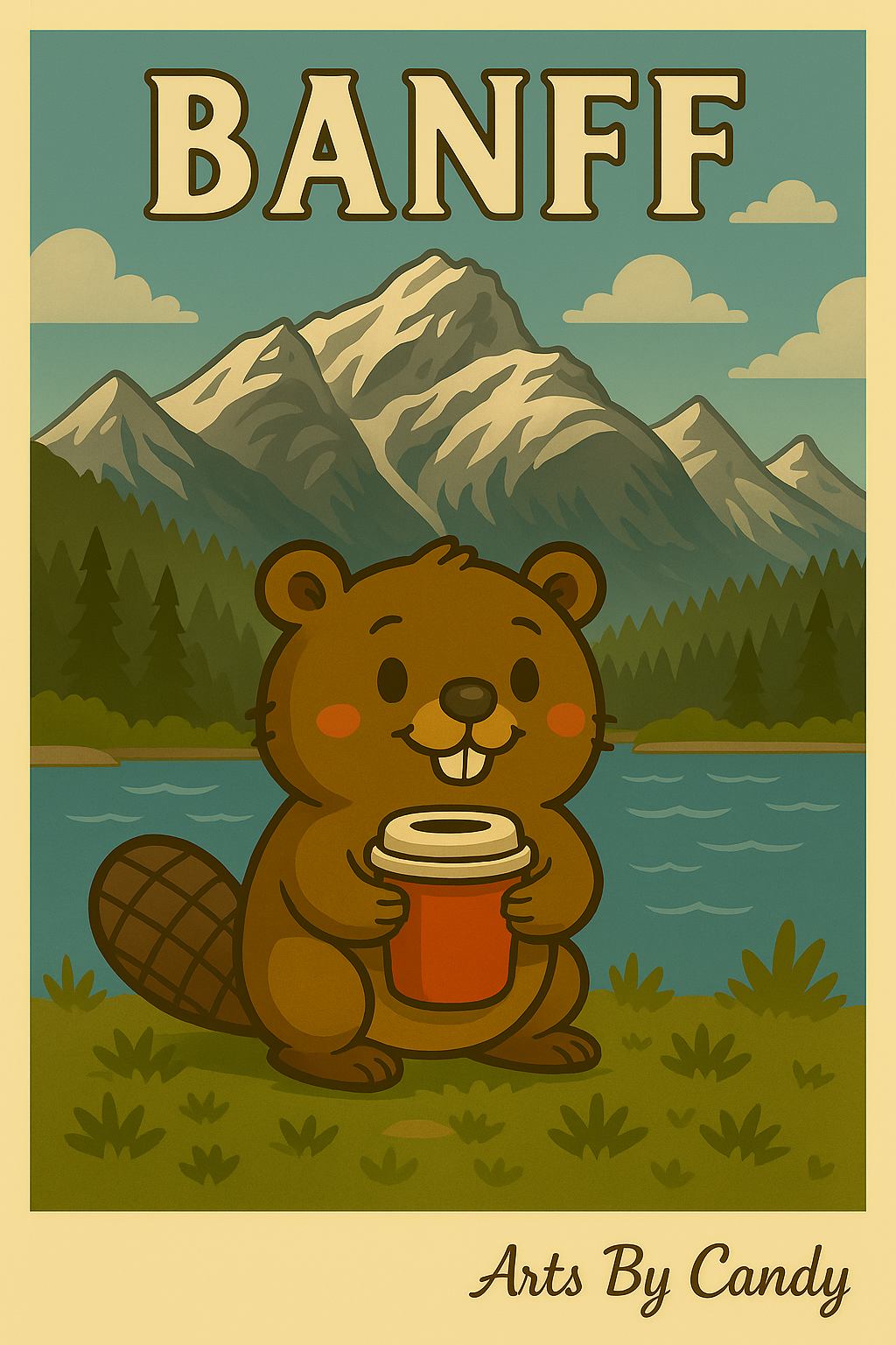 Breathe in the fresh mountain air with this charming Banff postcard, featuring a cheerful beaver sipping coffee against the backdrop of Canada’s majestic Rocky Mountains. Surrounded by pine trees, crisp waters, and snowy peaks, this cozy scene captures the peaceful beauty of Alberta’s most iconic national park.