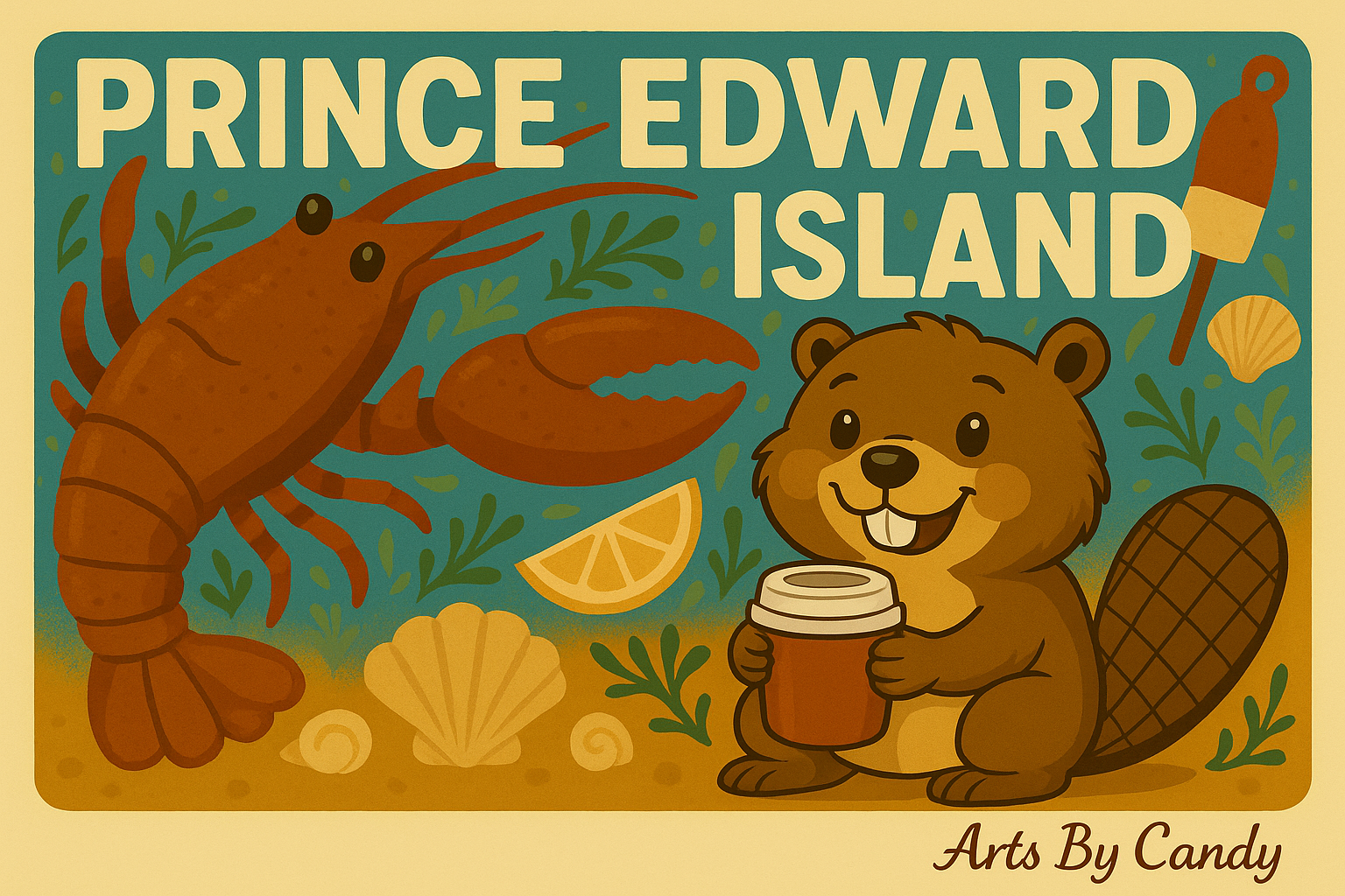Celebrate the salty breeze and seafood delights of Canada’s smallest province with this playful Prince Edward Island postcard! Featuring a cheerful beaver clutching coffee alongside a giant lobster, seashells, and ocean-themed icons, this design captures the coastal magic and maritime flavor of PEI. Part of Candy’s Canadian Collection, this vintage-inspired illustration brings together bold colors, cute characters, and iconic local elements—perfect for collectors, travelers, or anyone craving a splash of East Coast charm.