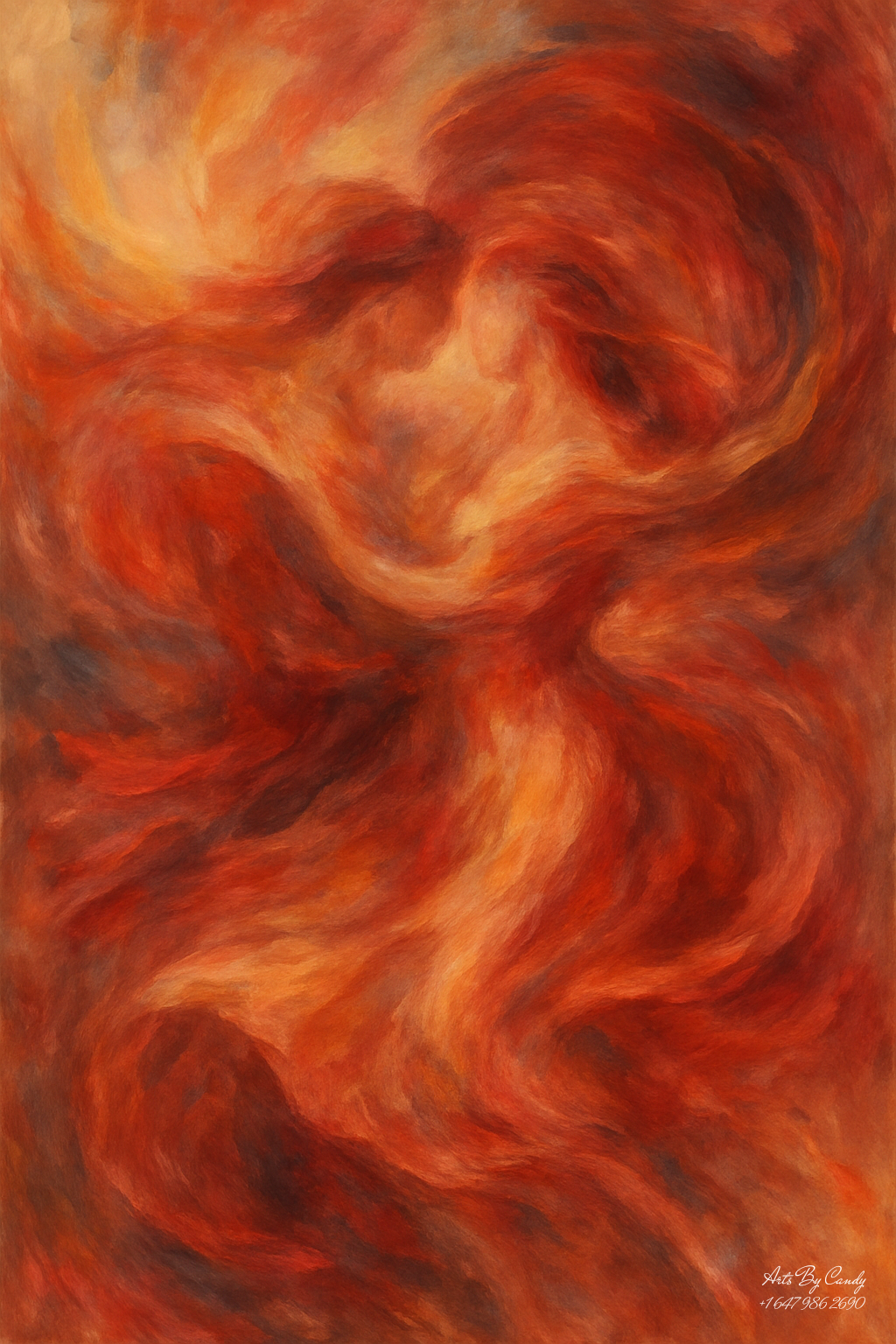Silhouetted Embrace is a stirring tribute to intimacy suspended in time — where two figures meet in a swirl of fire and shadow, captured in a breath before the kiss. Flowing hues of crimson, copper, and golden flame ripple across the canvas like wind-stirred silk, echoing both the heat of passion and the vulnerability of connection.
